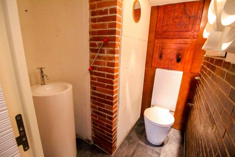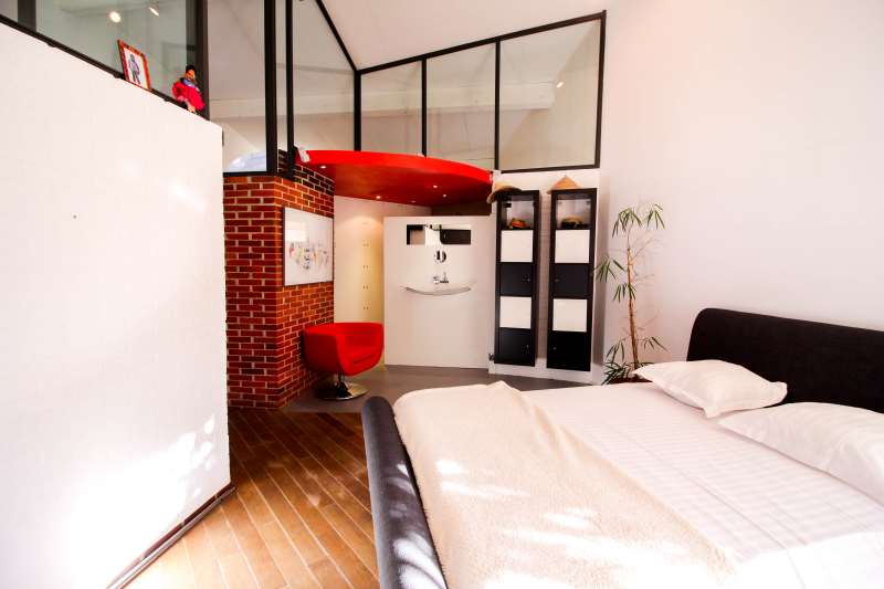 - A design bathroom with its red wall of bricks opened on the bedroom with an Italian-style shower, a beautiful bowl, a mirror and shelves. The toilet is also in the bathroom.
