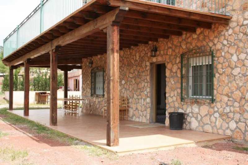 Ya en el exterior, los huéspedes podrán disfrutar del porche amueblado donde organizar comidas y cenas preparadas en la barbacoa de obra. Aquí se encuentra el aseo. Desde este espacio se pasa directamente al jardín con una gran piscina vallada (compartida con los propietarios).